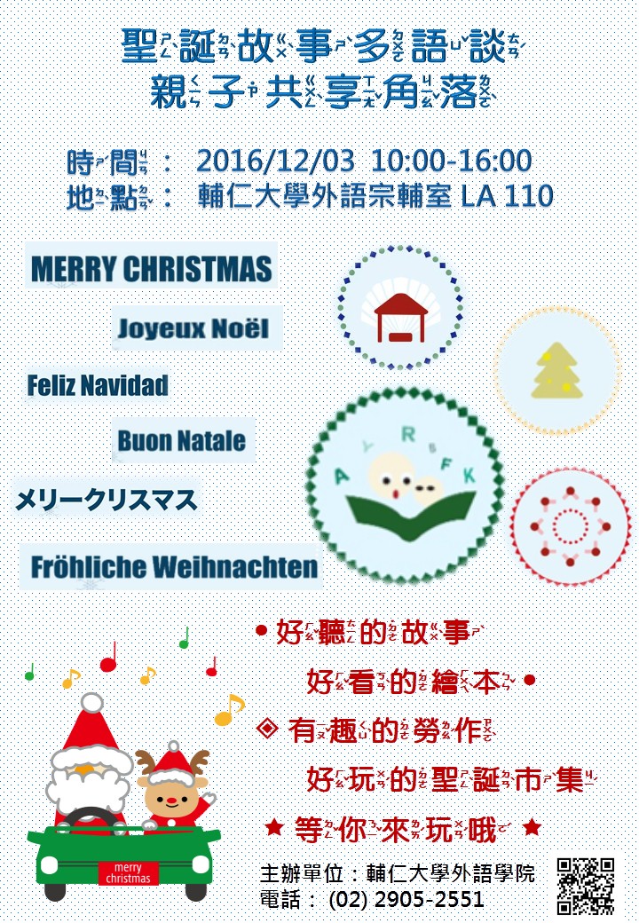 同時外語學院也將於特定時段安排多國語言聖誕小故事角落,讓小朋友們能傾聽六國語言的聖誕小故事。同時,我們也設置「街頭藝人」表演空間,由外語學院各系學生擔綱演出各種音樂項目,歡迎參觀群眾踴躍打賞,鼓勵表演者的熱情演出。