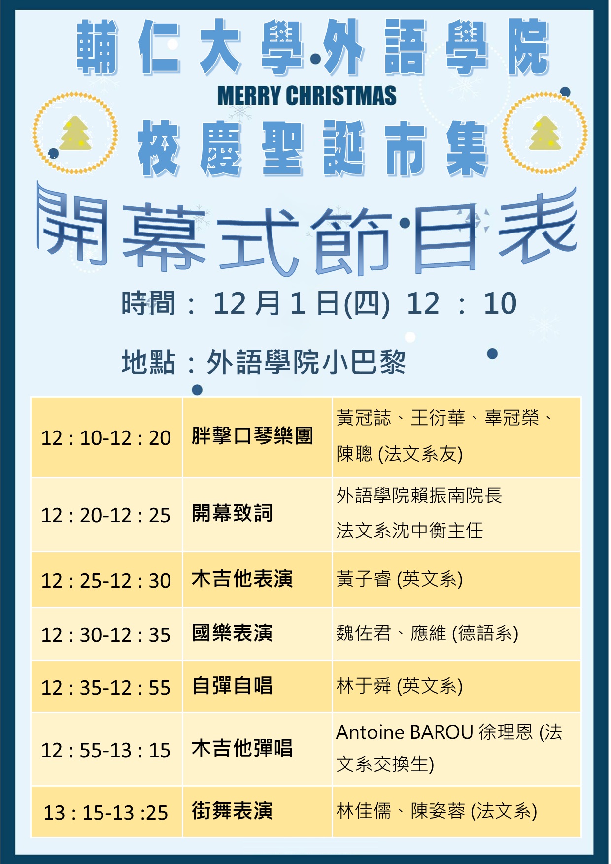 本活動將於12月1日至12月3日一連三天於輔大著名景點「小巴黎」周邊隆重登場,配合校園聖誕季節之點燈活動,校友以及民眾尤其可以在黃昏之後前來輔大校園欣賞繽紛夜景,由校門正門口之巨型聖誕樹開始,順著中央大道之亮眼燈飾引導,前來「小巴黎」吃喝玩樂,更可以繼續前往淨心堂前欣賞莊嚴溫馨之耶誕馬槽造景,瞭解真正聖誕節的意義。